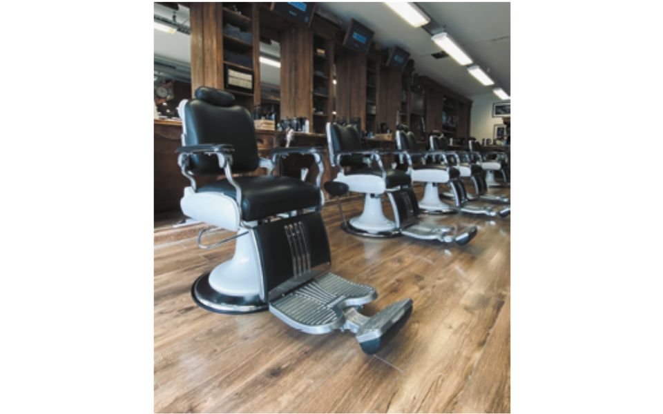Parquet à grandes lames, soubassement en bois sur les murs, canapé Chesterfield XXL meuble de 12 mètres de long et 6 fauteuils de barbier Takara Belmont positionnés en enfilade pour travailler en binôme… Tout a été pensé pour le bien-être au masculin. Autre pièce maîtresse du salon : le magnifique bar en plein milieu de l’espace qui ajoute de la convivialité à cet endroit cosy et élégant.