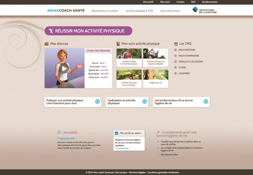 Le programme Mon Coach Santé veut montrer que le bien-être passe aussi par la nutrition et la santé physique et morale. Chaque utilisateur du programme est accompagné de façon individuelle et peut réaliser un bilan santé régulier et personnalisé. L’accès aux contenus interactifs et conseils adaptés est gratuit. Les thèmes alimentation et nutrition, activité physique et Troubles musculo-squelettiques (TMS) et sommeil et stress sont ainsi abordés.