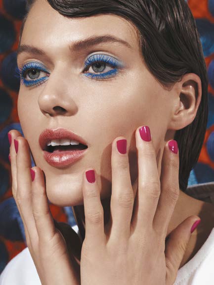 – Déposer sur les cils supérieurs et inférieurs du mascara bleu électrique.
