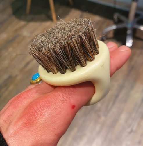 De mon expérience en barber shop, en Australie, j’ai gardé une brosse à barbe qui se porte comme une bague et que j’utilise pour mes coupes hommes, plutôt qu’un peigne classique.