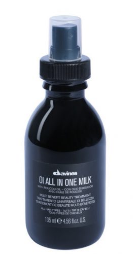 Pour les finitions, j’utilise le lait sans rinçage à l’huile de roucou, Oi All In One Milk de Davines qui hydrate et apporte de la brillance. Il sent bon !