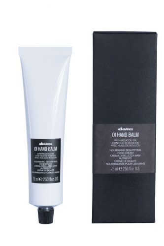 La crème de soin pour les mains, Oi Hand Balm, de Davines. Nourrissante, hydratante, elle ne colle pas. La peau l’absorbe si vite qu’on peut reprendre le travail immédiatement. J’aime son parfum.