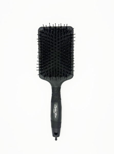 La brosse écoresponsable que nous avons développée, conçue moitié sanglier et moitié nylon. Sa ligne courbée suit la forme de la boîte crânienne tandis que la disposition des poils permet un démêlage rapide. Le manche est réalisé en matériaux recyclés.