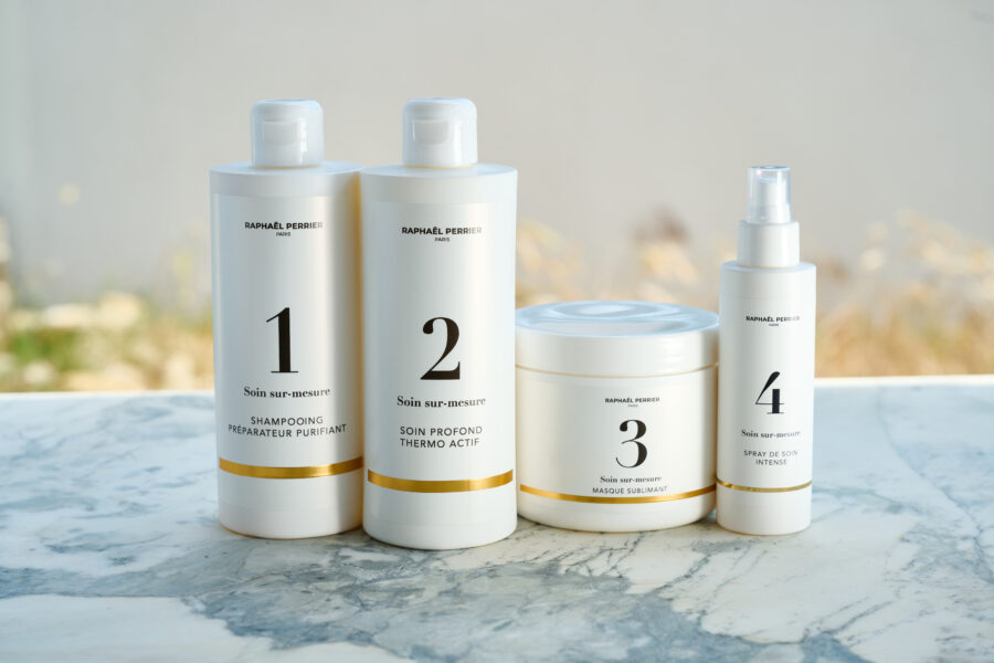 Le Soin sur-mesure de Raphaël Perrier, enrichi en kératine de blé. Il permet de combler toutes les parties abîmées en créant un ciment uniquement aux endroits où le cheveu est sensibilisé.