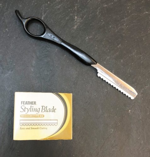 Mon Blade Feather. J’ai commencé avec les techniques de Vidal Sassoon aux ciseaux. Des coupes très nettes. Avec cet outil, je peux non seulement tracer des formes géométriques mais aussi faire mes finitions et créer une texture plus allégée.