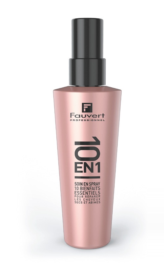 Le soin Spray sans rinçage 10 en 1 de Fauvert. Je l’applique après le shampooing, avant le coiffage, il facilite le démêlage, discipline et gaine le cheveu tout en le parfumant. Sur cheveux décolorés, il est