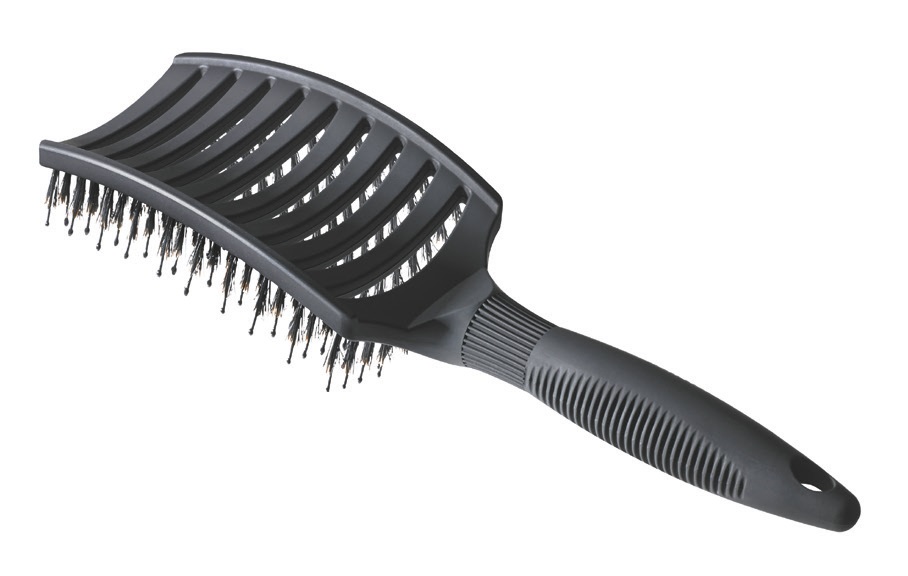 La brosse démêlante de Jacques Seban. Carrée, souple et légèrement courbée pour mieux épouser la forme du crâne, mi-poils, mi-picots, elle s’utilise sur cheveux secs ou mouillés, pour démêler en douceur ou pour faire un brushing, au bac comme au fauteuil. Je la vends beaucoup à ma clientèle.
