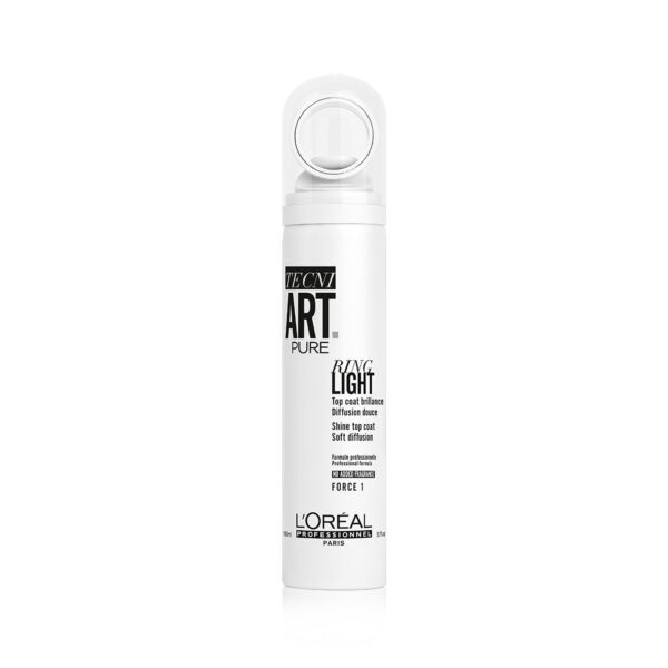 Ring Light Pure de Tecni.Art chez L’Oréal Professionnel. Ce spray brillant permet de finaliser les coiffures, contrôler la brillance et maîtriser les petits cheveux.