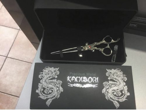 Mes ciseaux japonais Kamisori de taille 8 avec leur manche en argent. Ils sont parfaits pour la fluidité de mes gestes. Ils me permettent de texturiser et de personnaliser chaque coupe.
