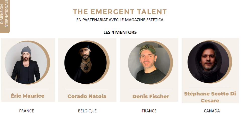 - The Emergent Talent : 8 jeunes talents émergents internationaux découverts par quatre mentors : Éric Maurice, Corado Natola, Denis Fischer, Stéphane Scotto Di Cesare.