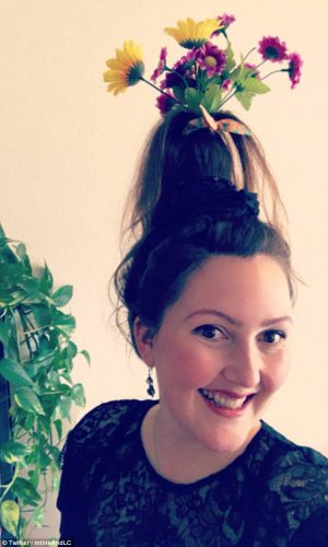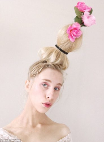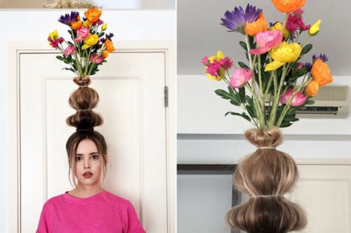 Le principe du Flower Vase Hair est tout simple : créer un vase sur la tête. Autrement dit : monter un chignon sur la base d’une bouteille en plastique et y planter… des fleurs.