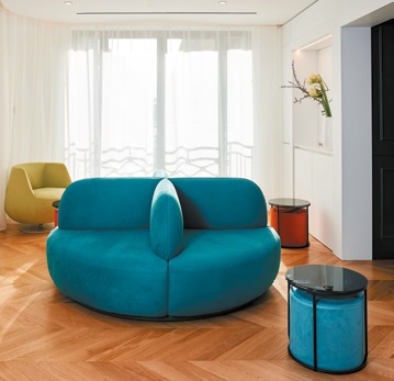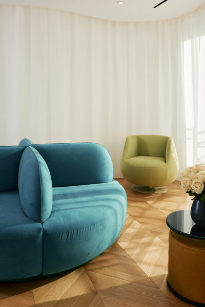 Deux espaces sont dédiés au diagnostic cosmétique personnalisé et permettent une retouche de maquillage après le soin. Un ascenseur mène au premier étage. La porte s’ouvre sur une salle d’attente très colorée, avec un élégant canapé bleu, où chaque cliente est isolée de l’autre, et des poufs de plusieurs couleurs. Visuellement, ce mobilier de la marque espagnole Sancal est une vraie réussite.