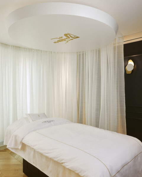 C’est l’agence d’architecture Studio Kompa qui a travaillé sur l’identité de marque. Les codes couleur sont ceux du luxe, blanc et or, pointe d’anthracite. Chaque cabine possède donc un mur gris, des murs blancs, de la robinetterie dorée, une cabine décor marbre, des tables chauffantes fabriquées par le groupe allemand Gharieni. De grands voilages blancs isolent la cliente dans un cocon. Le parquet au point de Hongrie est neuf, comme les moulures, pour donner un effet haussmannien.