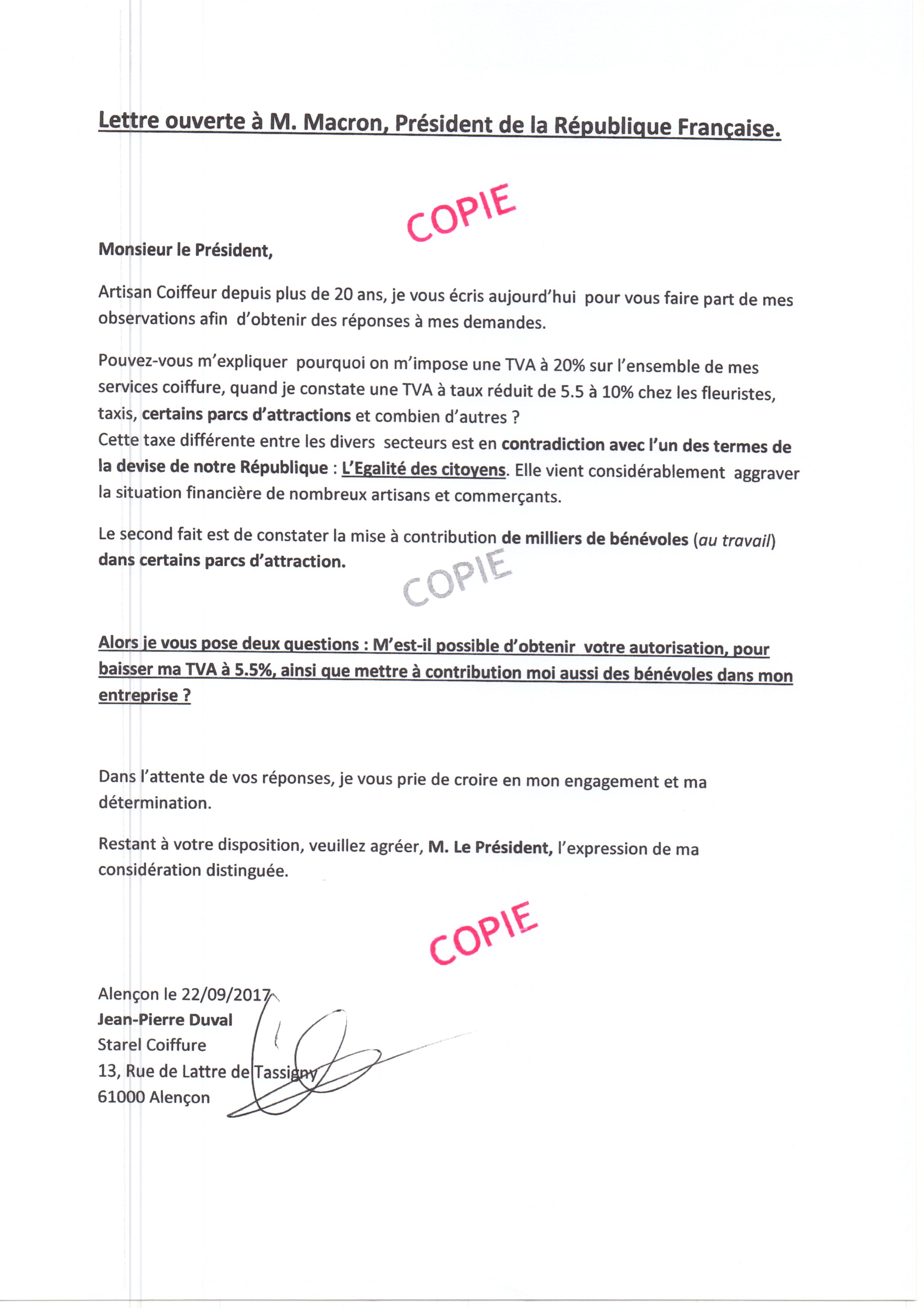 Jean-Pierre Duval coiffeur basé à Alençon, propriétaire du salon Starel Coiffure, et employant plusieurs personnes, nous a fait parvenir sa lettre ouverte hier soir, qu’il a aussi transmis à Bruxelles, l’UNEC, le CNEC