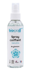 Biocoiff’ lance le spray coiffant au géranium, certifié bio, vegan, fabriqué en France et cruelty free grâce à l’utilisation de la gomme d’élémi pour son pouvoir fixant.