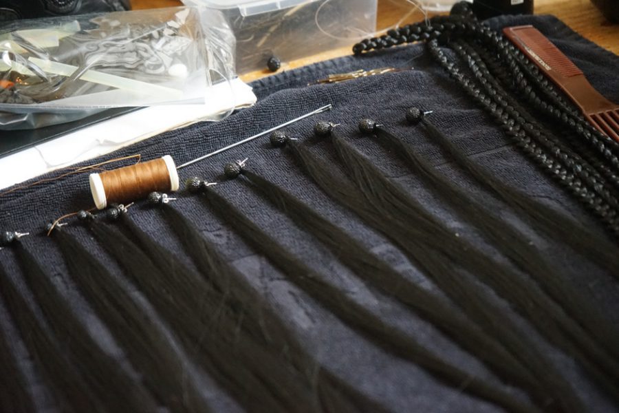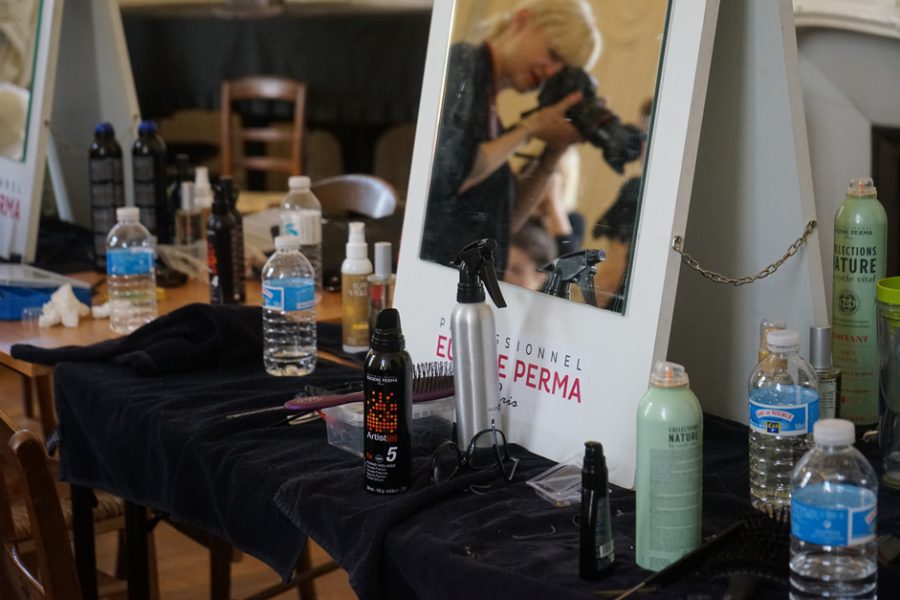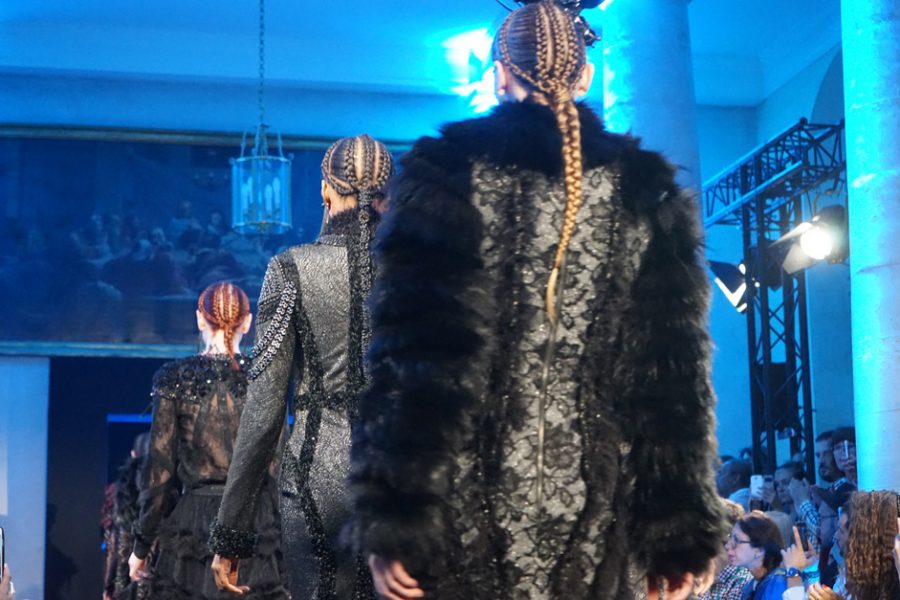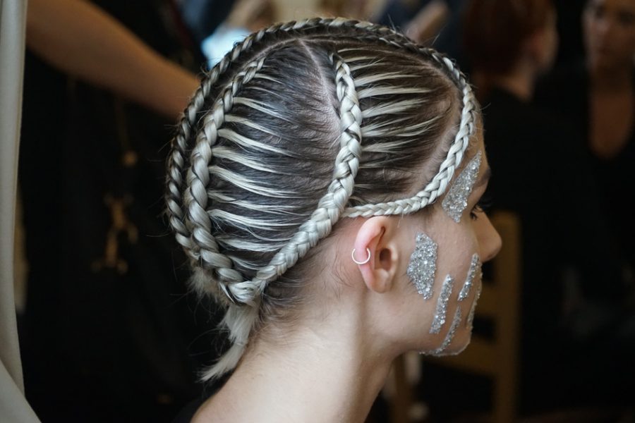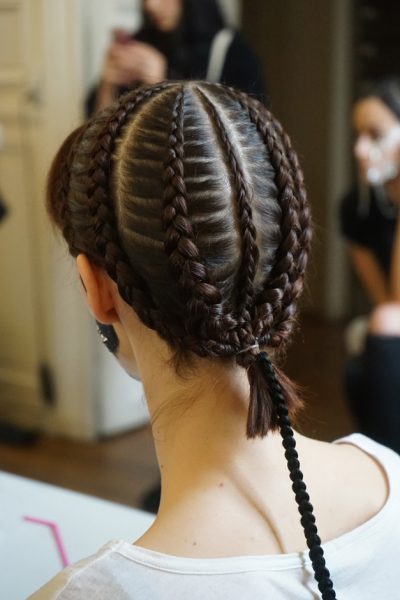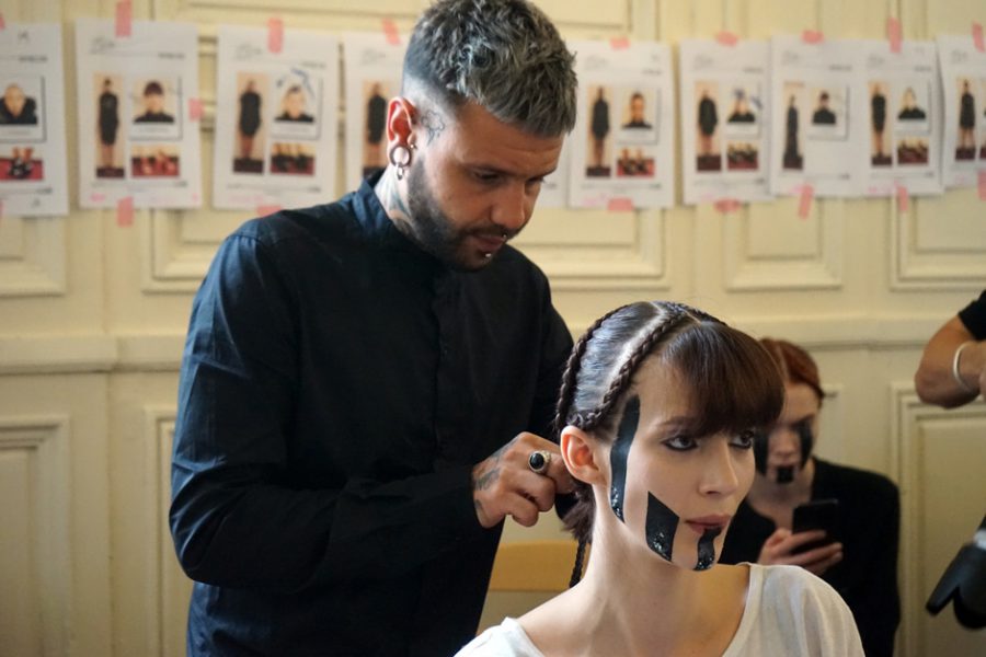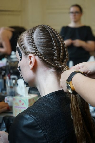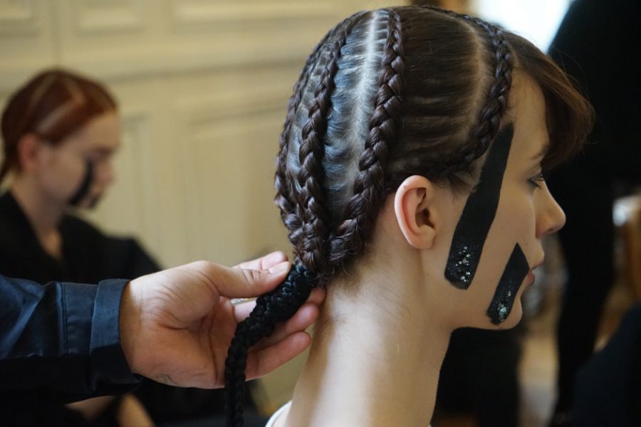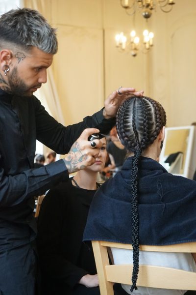 Christophe Pujol, chef de cabine pour Eugène Perma Professionnel, était aux commandes pour la partie coiffage. Les tresses étaient à l’honneur sous toutes leurs formes. La petite touche d’originalité ? Les boucles d’oreilles en mèches de cheveux noires histoire d’aller jusqu’au bout de la thématique. On vous laisse voir en images le déroulement de la journée, de la préparation des modèles au défilé.