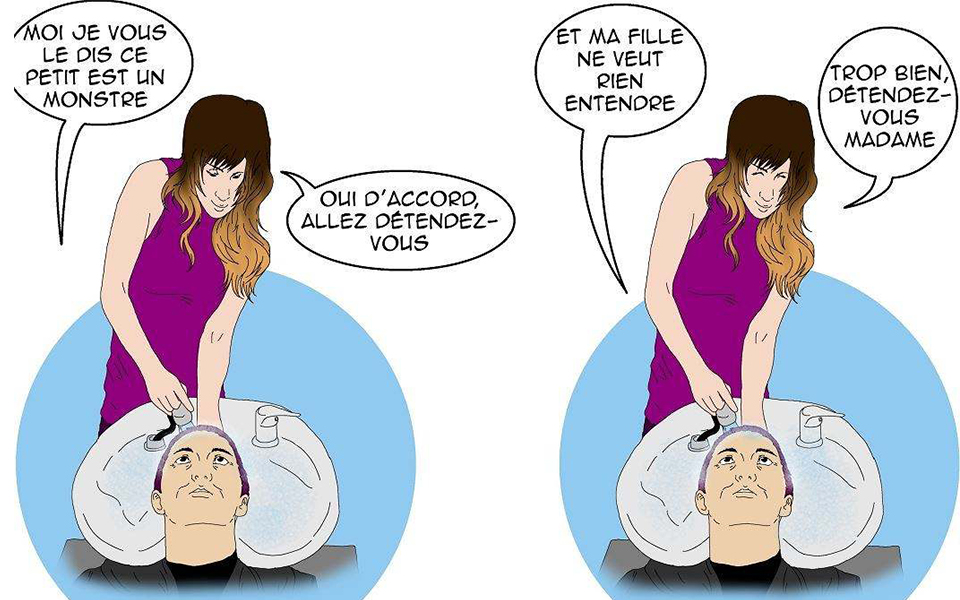 Pimp my Hairdresser : le silence… est une vertu ! par Pimp My Hairdresser 31/03/2018 Envoyez Twittez Partagez Pimp My Hairdresser 19 posts Taille du texte: A A A Détendez vous, calmez-vous, respirez… mille façons de dire à son (ou sa) cliente(e) de se calmer et d’arrêter de jacasser ! Pourtant cette cliente de Pimp semble bien décidée à discuter… Mais elle va la fermer sa g… grande bouche ! Catégories: Actualités Envoyez Twittez Partagez Pimp My Hairdresser 19 posts Précédent Suivant Plus d'actualités Le nouveau numéro de Biblond est dans votre boîte aux lettres ! Cap sur les tendances du printemps ! Rejoignez le groupe Dessange International ! Recyclage des cheveux : mouvement de fond ou conséquence de la covid-19 ? Partez à la conquête des jeunes grâce aux nouvelles technologies ! 1 marque, 1 histoire : Jacques Seban