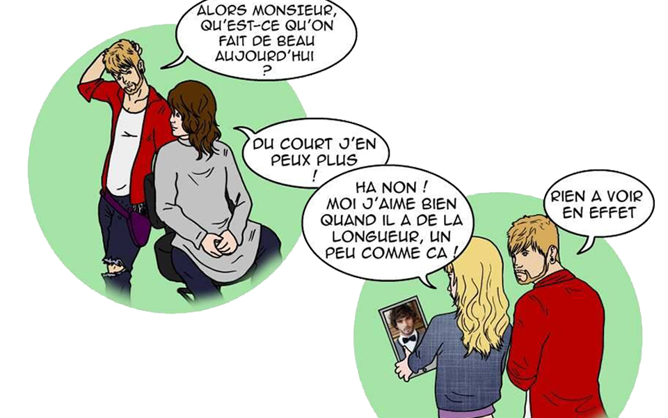 Un client a toujours une idée plus ou moins précise de ce qu’il veut… Mais imaginez quand sa moitié s’en mêle ? C’est avec humour que Pimp My Hairdresser illustre la dualité d’une coupe « sidecut » !