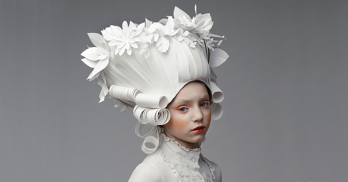 Pour recréer des coiffures et revenir sur certaines périodes historiques, l’artiste russe, Asya Kozina, utilise des sculptures de papier. Sa dernière collection intitulée « baroque paper wigs » ou « perruques baroque en papier » reprend les coiffures sauvages des femmes et des hommes de l’époque victorienne. Les feuilles de papier sont sculptées individuellement puis assemblées afin que le résultat soit le plus précis. Grâce à cette méthode, les perruques sont plus naturelles et la texture du papier se rapproche de celle des cheveux.