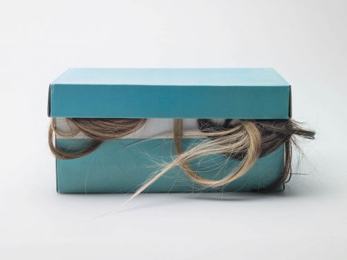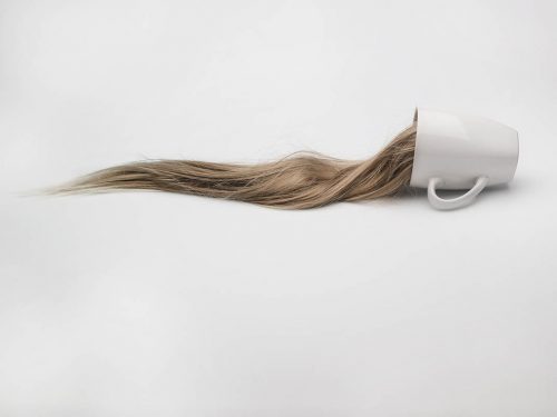 L’artiste bouscule les codes et modifie la place des éléments d’origine. De beaux cheveux que l’on extrait de leur base pour les accrocher à des objets ordinaires : une tasse, une serviette, une boîte… et le regard change. Le banal devient surréaliste.