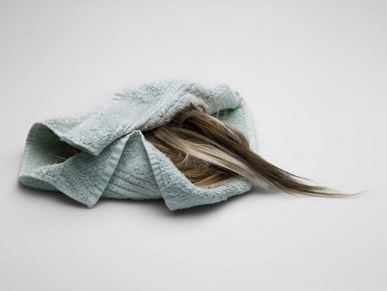 L’artiste bouscule les codes et modifie la place des éléments d’origine. De beaux cheveux que l’on extrait de leur base pour les accrocher à des objets ordinaires : une tasse, une serviette, une boîte… et le regard change. Le banal devient surréaliste.