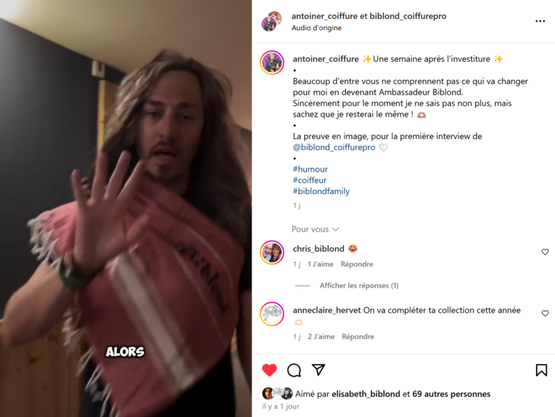 Vu sur Instagram, Antoine Renson @antoiner_coiffure, fraîchement intégré à la #biblondfamily, n’a pas perdu de temps pour marquer les esprits ! Une semaine après l’annonce officielle de son rôle d’ambassadeur, il a déjà pris ses fonctions… avec humour. Une mise en scène qui a bien fait rire sa communauté, et qui prouve qu’en plus d’être talentueux notre ambassadeur manie l’autodérision à la perfection !