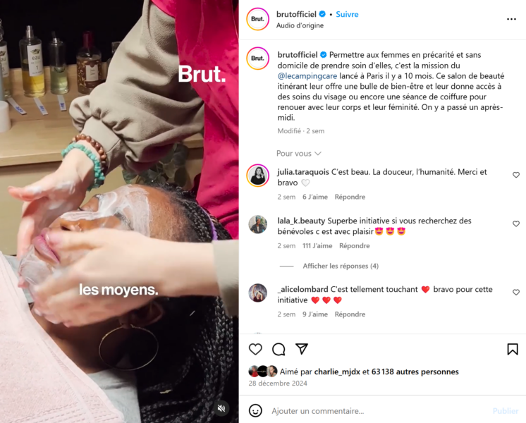 Vu sur Brut Instagram, @lecampingcare, un projet lancé il y a dix mois à Paris, qui a pour mission de venir en aide aux femmes en situation de précarité ou sans domicile. Ce salon de beauté itinérant leur propose des soins du visage, des séances de coiffure, et une bulle de bienêtre. Une initiative touchante qui permet à ces femmes de se reconnecter à leur féminité et de retrouver un peu de dignité, dans un cadre chaleureux et bienveillant.