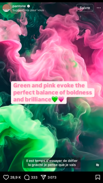 Vu sur Instagram, Pantone @pantone, frappe fort avec son duo de couleurs green and pink. Cette association, à la fois vibrante et harmonieuse, s’impose comme une inspiration phare dans l’univers de la mode, de la beauté, et même de la coiffure. Une palette pleine de caractère pour marquer l’année avec style. Une référence au film Wicked ?