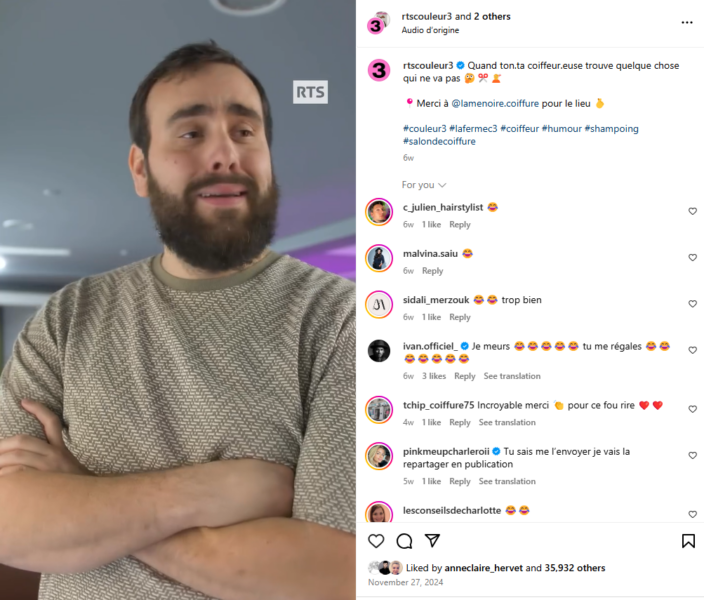 Vu sur Instagram, le média suisse RTS Couleur 3, @rtscouleur3, a marqué les esprits avec une vidéo humoristique mettant en scène une cliente face à son coiffeur, qui a remarqué qu’elle avait été… infidèle à son salon habituel ! Une situation cocasse, familière pour de nombreux coiffeurs. Entre gêne et éclats de rire, ce sketch met en lumière avec humour une réalité bien connue du métier.