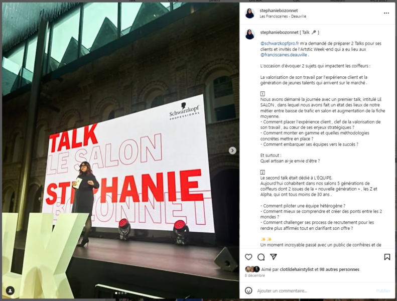 Et que dire de Stéphanie Bozonnet, captivant l’audience avec ses conférences enrichissantes ? Stéphanie a animé deux talks cruciaux pour les coiffeurs : le premier sur la valorisation du travail par l’expérience client, abordant les stratégies pour améliorer la qualité de service et l’engagement des équipes ; le second sur la gestion d’équipes multigénérationnelles, explorant les méthodes pour harmoniser les talents des générations Z et Alpha avec les processus de recrutement et la communication interne. Ces discussions ont été une opportunité exceptionnelle pour les professionnels du secteur, tous prêts à embrasser le changement et à se préparer pour 2024.