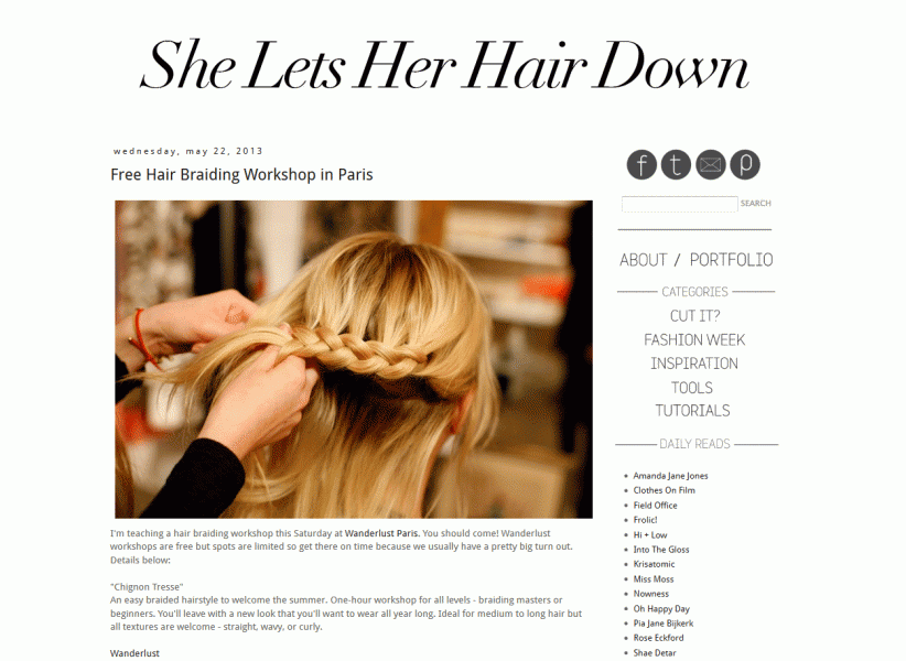 Tutos, photos insolites, conseils produits/accessoires , actualités, tendances : On peut tout trouver (où bien presque) dans le blog de la hair styliste américaine Ruby Jones. She Lets Her Hair Down est tenu par cette jeune coiffeuse de talent qui à a cœur de transmettre sa passion et son métier. Ce blog est donc un puit d’inspiration pour vous les coiffeurs.
