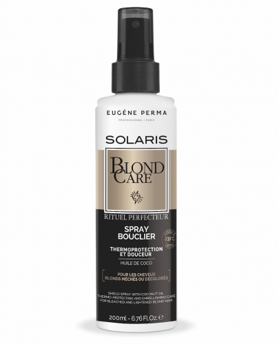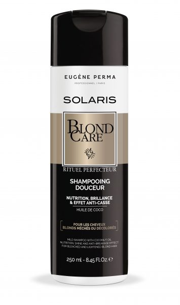 Pour vos clientes aux cheveux blonds, Eugène Perma Professionnel propose la ligne Solaris, un rituel perfecteur composé d’un Shampooing Douceur et d’un Spray Bouclier. Action anticasse et nourrissante pour le premier, protection et force pour le second…