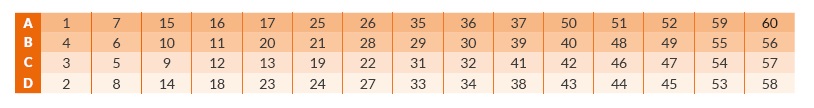 Retrouvez dans une des lignes A, B, C ou D du tableau ci-dessous, les numéros des propositions qui vous ont été soumises. Entourez les numéros lorsque vous avez répondu « plutôt vrai » et ne faites rien lorsque vous avez répondu « plutôt faux ».
