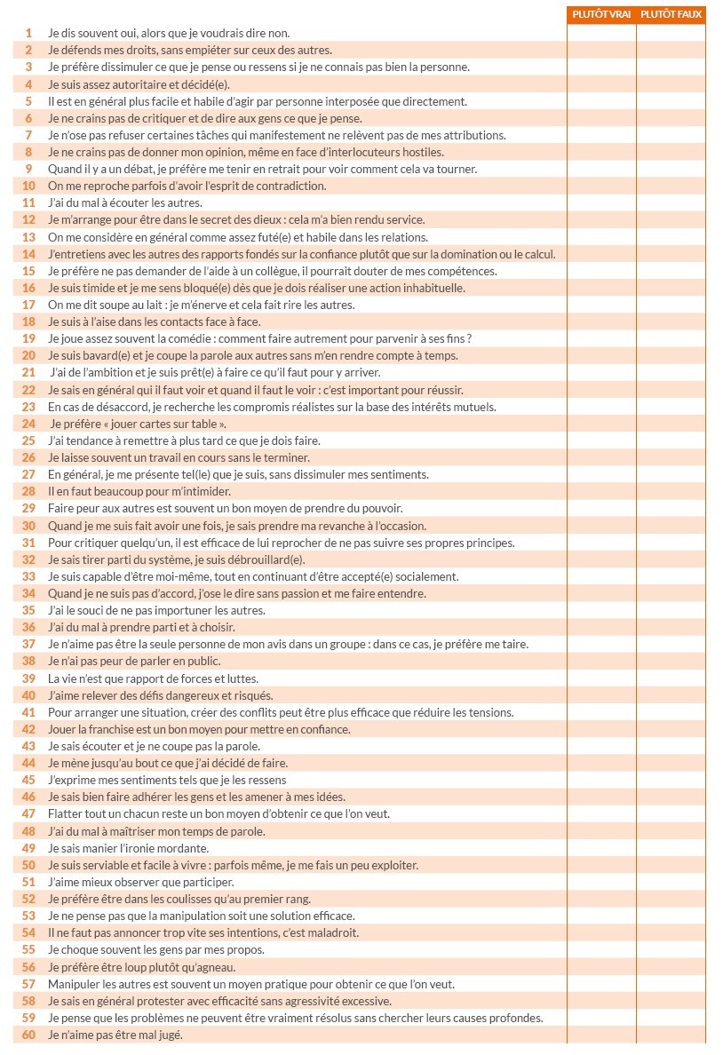 Élaboré par l’émérite psychologue américain Leonard V. Gordon, le test que nous vous proposons ci-dessous préfère employer la notion « d’assertivité ». Issu de l’anglais « to assert » (affirmer, soutenir), ce terme désigne la capacité à exposer et à défendre son point de vue dans le respect de l’autre.