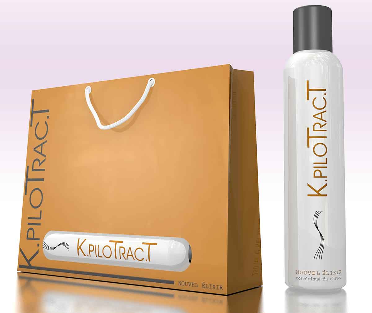 En phase absolue avec la tendance actuelle du soin détente, K.PILOTRAC.T a développé une gamme de produits cosmétiques adaptés aux cheveux. Alliant plaisir sensoriel et volonté de réparation, l’utilisateur des produits K.PILOTRAC.T applique au pied de la lettre la notion de « prendre soin » de sa capillarité. Le produit phare de cette gamme de cinq produits est le Nouvel Elixir. Cette eau de soin sans rinçage s’applique sur tous types de cheveux, secs, propres et essorés. Composé d’huile de camélia, cet élixir au toucher sec a des vertus réparatrices, adoucissantes et nutritives. Très riche en acide oléique, cet émollient a été formulé pour démêler les cheveux, faciliter le brushing, rendre les cheveux brillants, parfumer et hydrater le cuir chevelu. Il protège du dessèchement et des agressions microbiennes.