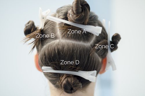 #01 Diviser la chevelure en quatre zones (A, B, C, D).