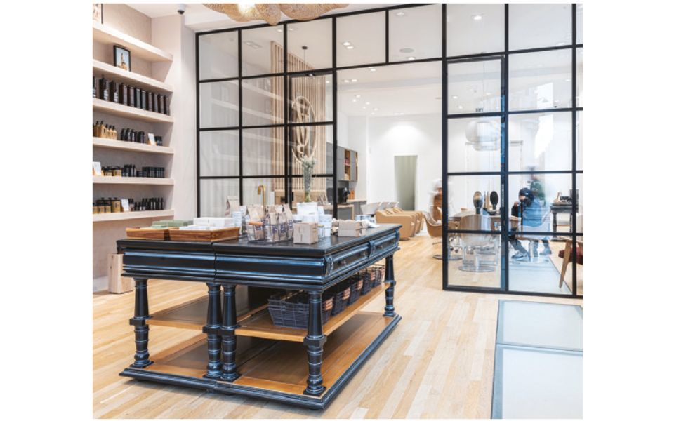 À la fois salon de coiffure, boutique et centre de formation, ce flagship lumineux de 200 m2 revendique son goût pour les matières nobles et naturelles comme le bois, le verre ou encore la pierre.