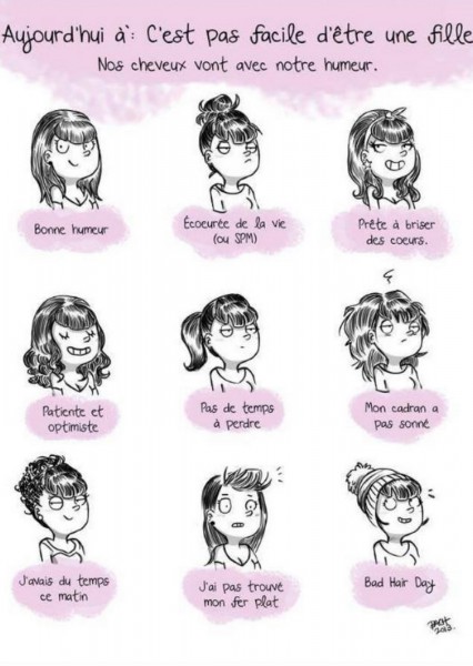 La planche de dessin « C’est pas facile d’être une fille » présente une les déboires d’une jeune fille face au choix de sa coiffure et ses expressions selon son humeur.
