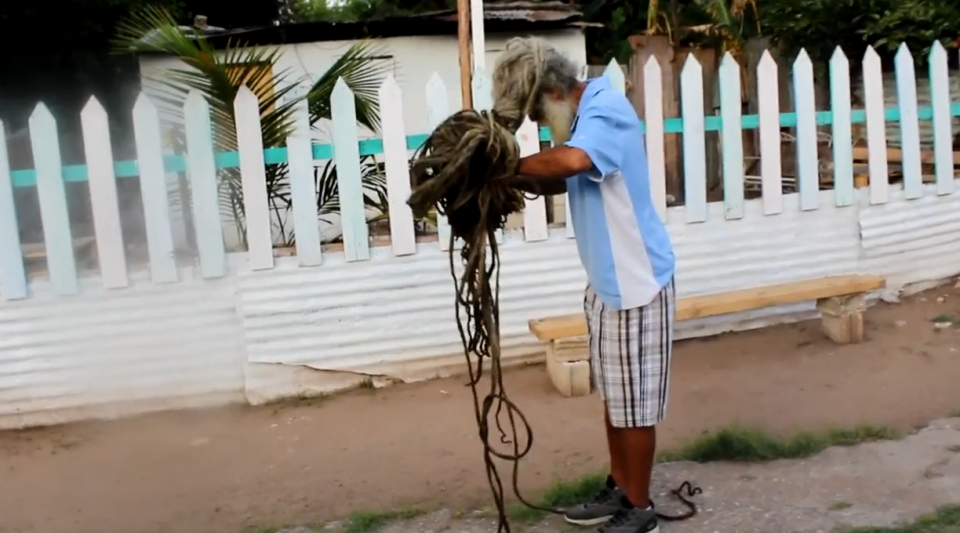 L’homme aujourd’hui âgé de 55 ans laisse pousser ses dreadlocks depuis l’âge de 15 ans. Si nous sommes bons en calcule mental, cela fait donc 40 années que notre rastaman laisse pousser ses cheveux. Et le moins que l’on puisse dire c’est que ceux-ci, une fois déployés, atteignent une longueur tout à fait impressionnante.
