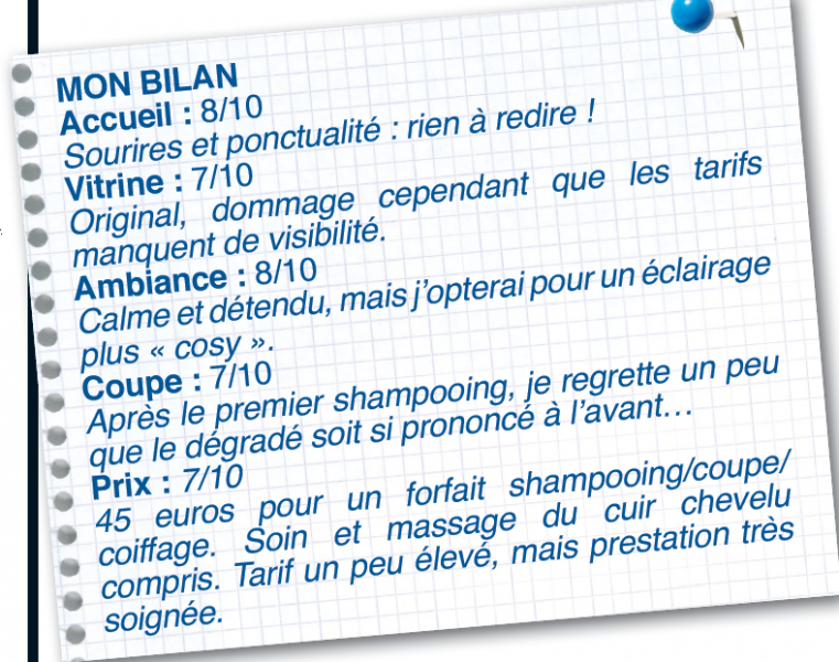 Ici, on semble loin du salon de base. Des fauteuils vintage relookés et des cuirs seventies à chaque poste… Je suis chaleureusement accueillie par une coiffeuse, Fanny, toute souriante. Je n’ai pas le temps de lézarder dans l’espace d’attente. Dommage ! En un coup d’oeil, je remarque un choix éclectique de magazines qui paressent sur un canapé club en cuir vieilli : Côté Déco, Elle, Rock and Folk, Psychologie magazine et Courrier international… Qui a dit que chez le coiffeur, on